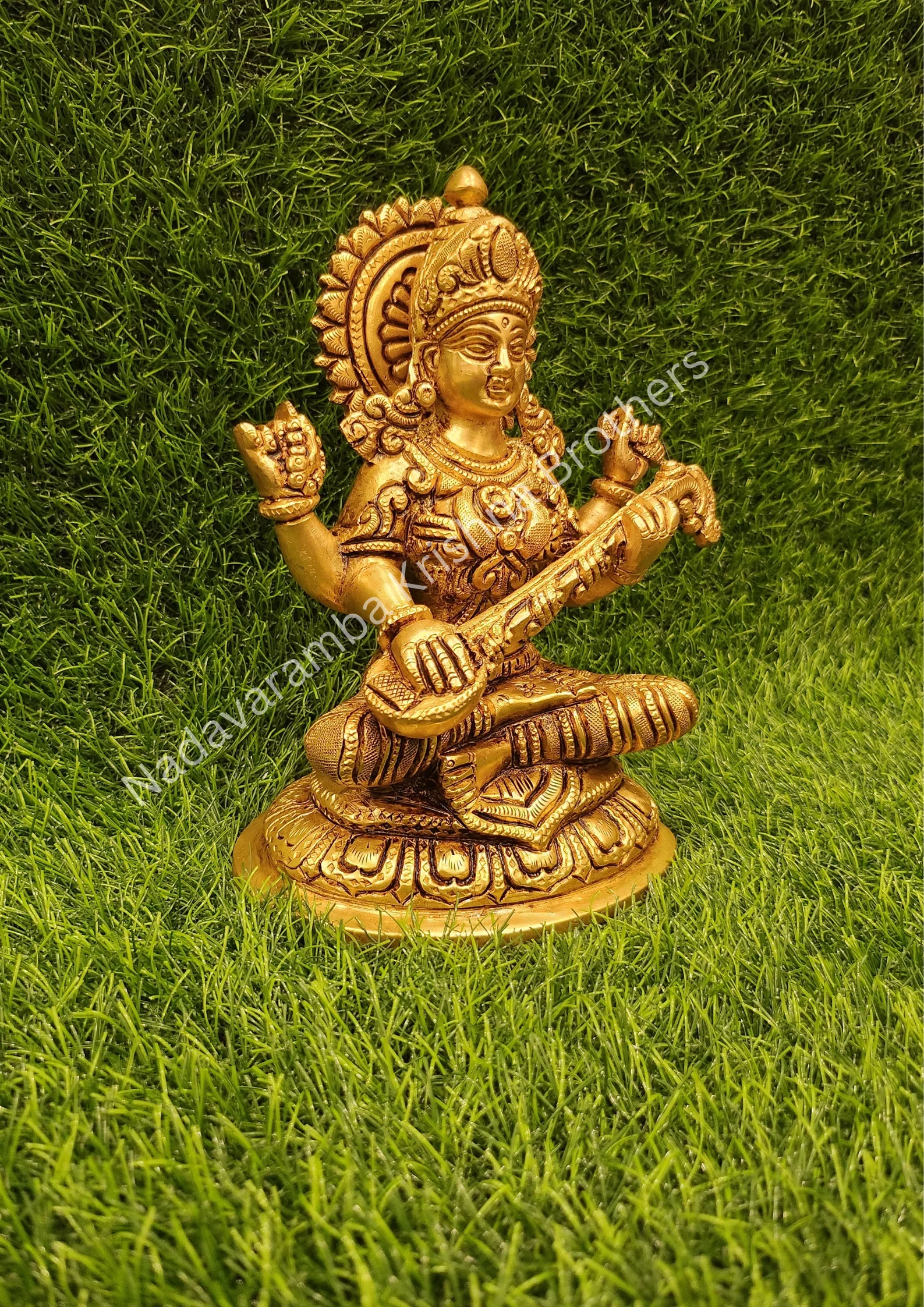 Total height – 7.5 inches & Width – 5 inches. Statue weighs approximately 2.2 Kg. This Goddess Saraswati/Saraswathy is fully made out of Brass & is finished with utmost craftsmanship and is in Antique finish. This Antique finish will last long if maintained properly. Goddess Saraswati is believed to be the goddess of wisdom & knowledge.